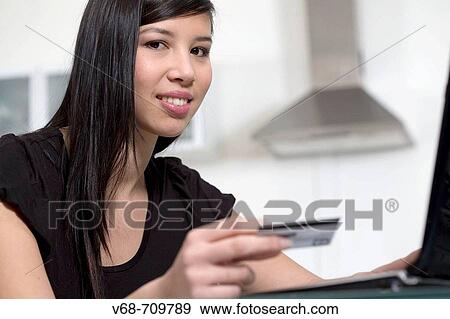 adult, asian ethnicity, at home, bank card, brunette, color image, computer, contemporary, credit card, dark hair, ease, easiness, easy, ethnic, ethnicity, female, female only, head and shoulders, holding, home, indoors, inside, interior, internet, kitchen, laptop computer, lifestyle, looking at camera, money, one, one person, one woman only, pc, people, personal computer, shopping, sitting, smile, spend, spending, use, woman, woman (only), young, young adult, youth, stock image, images, royalty free photo, stock photos, stock photograph, stock photographs, picture, pictures, graphic, graphics, fine art prints, print, poster, posters, mural, wall murals, v68-709789, v68 709789, v68709789