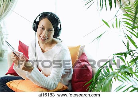 20-25 years, asia, asian ethnicity, at home, black hair, cd case, chinese ethnicity, colour image, couch, domestic life, earphones, enjoyment, free time, hair back, half length, happy, headphones, holding, horizontal, indoor, leisure, leisured, leisurely, listening, looking at camera, one person, pillow, portraits, recreation, relax, relaxation, relaxing, repose, sensory perception, sitting, smiling, sofa, spare time, time off, toothy smile, top, window, woman, young adult, stock image, images, royalty free photo, stock photos, stock photograph, stock photographs, picture, pictures, graphic, graphics, fine art prints, print, poster, posters, mural, wall murals, ai16183