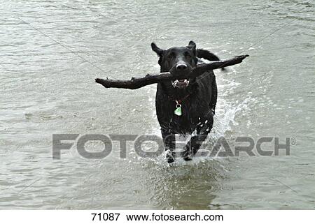 animal, black dog retrieving stick, dog, domestic animal pet mammal, mammal, vertebrate, water running playing, stock image, images, royalty free photo, stock photos, stock photograph, stock photographs, picture, pictures, graphic, graphics, fine art prints, print, poster, posters, mural, wall murals, 71087