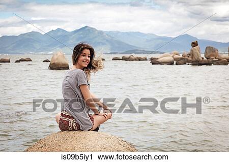18 to 19 years, carefree, cloud, female, getting away from it all, happiness, looking at camera, looking over shoulder, mountain, only one teenage girl, rear view, rocks, sea, serene people, sitting, smiling, teenage girl, teenager, waist up, woman, young woman, stock image, images, royalty free photo, stock photos, stock photograph, stock photographs, picture, pictures, graphic, graphics, fine art prints, print, poster, posters, mural, wall murals, is09b5iy1