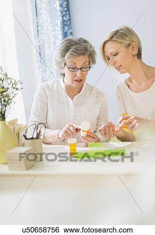 45-49 years, 55-59 years, assistance, bottle, casual clothing, caucasian ethnicity, day, desk, differential focus, eyeglasses, female nurse, healthcare, healthcare and medicine, home, indoors, looking, mature, medical, medication, nurse, only mature women, pill bottle, pill dispenser, planning, prescription drug, prescriptions, reading, sitting, togetherness, two people, vertical, waist up, women, stock image, images, royalty free photo, stock photos, stock photograph, stock photographs, picture, pictures, graphic, graphics, fine art prints, print, poster, posters, mural, wall murals, u50658756