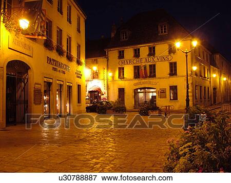Stock Photo -  France, Beaune, Burgundy, Cote de Beaune, Cote d'Or, Europe, Burgundy Wine Region, downtown, evening. Fotosearch